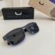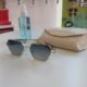 armazon de metal dorado ovalado con cristales grises con filtro UV. detalles en la patilla de acetato